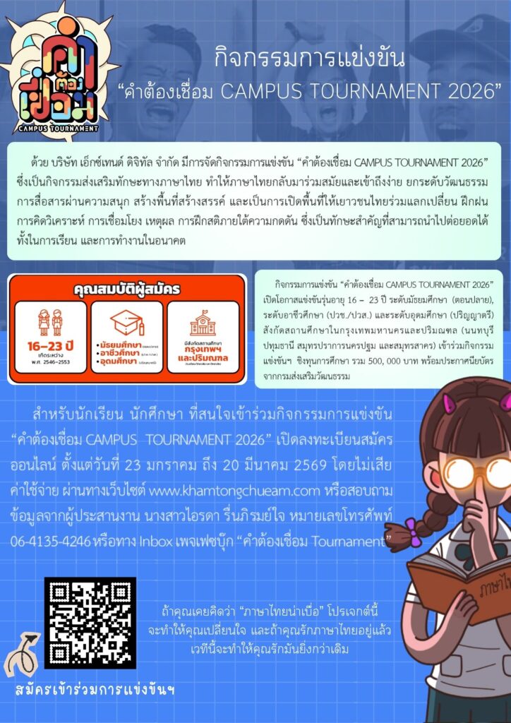 ประชาสัมพันธ์และเชิญชวนนักเรียนเข้าร่วมการแข่งขัน “คำต้องเชื่อม CAMPUS TOURNAMENT 2026” bussara sawangla 2 วัน ago Show, ข่าวประชาสัมพันธ์ ปิดความเห็น บน ประชาสัมพันธ์และเชิญชวนนักเรียนเข้าร่วมการแข่งขัน “คำต้องเชื่อม CAMPUS TOURNAMENT 2026” 16 Views Share Facebook Twitter